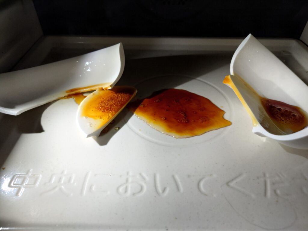 前回と前々回にこのレシピでカラメルを作る際、2回ともレンジ加熱中に皿が割れちまったのだが😅